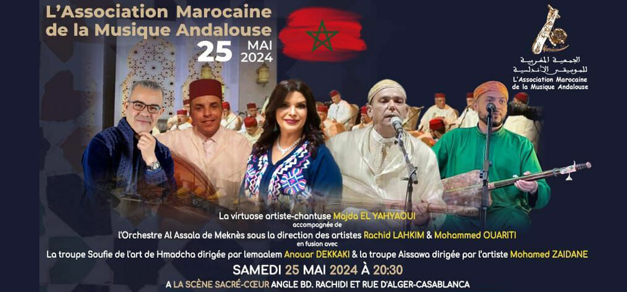 Rendez-vous le 25 mai 2024 avec le principal Malhoun Majda Al Yahyaoui, l'Orchestre Authenticité de Meknès, le Sufi Art Band Hamadsha avec le professeur Anwar Al Dakkaki et le Aissawa Popular Art Band avec le professeur Mohamed Zidane.